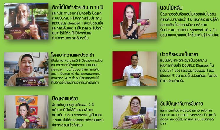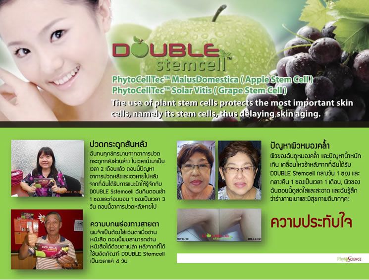 Double Stemcell นวัต กรรมที่จะเปลี่ยนแปลงโลก สู่การเอาชนะความเสื่อม คงความอ่อนเยาว์ พร้อมสุขภาพที่แข็งแรงอย่างสมบูรณ์แบบกับผลิตภัณฑ์ต้านความชราและฟื้นฟู สุขภาพ ด้วยสารสกัดที่ดีที่สุด ผลิตภัณฑ์หนึ่งเดียวในตลาดโลกที่ไร้คู่แข่งจากสวิสเซอร์แลนด์ ได้รางวัลชนะเลิศ Innovation Price ปี2008 จาก European Cosmatic ในหมวด Best Active Ingredient ผลิตภัณฑ์ดีเด่นของโลก ที่ มิเชล โอบามา และ Gwyneth Paltrow , Jennifer Lopez , Helen Mirren และเหล่าบรรดาคนดังของโลก และดาราฮอลลีวูด เลือกใช้ผลิตภัณฑ์นี้ จะทำให้คุณดูอ่อนวัยลงไปอีก 10 ปี สเต็มเซลล์ ช่วยให้หน้าใส ถุงใต้ตา เส้นร่องแก้ม สิว กระ ฝ้า รูปหน้าไม่กระชับ เนียนเรียบตื้นและจางลงภายในเวลา 1 เดือน และเห็นผลไวกว่าการทานกลูต้าไธโอน หรือคอลลาเจน ( กลูต้าไธโอนและคอลลาเจน จัดอยู่ในกลุ่มสารต้านอนุมูลอิสระ ) แต่สเต็มเซลล์อยู่ในกลุ่มการทดแทนเซลล์และสร้างเซลล์ใหม่ ที่เราเรียกกันติดปากว่า " หน้าเด็กด้วยสเต็มเซลล์ " ดับเบิ้ลสเต็มเซลล์ผลิตภัณฑ์ที่ดีที่สุดของนวัตกรรม " ต้านความชรา " และต้านความเสื่อมได้ถึงระดับเซลล์ และ DNA ปัจจุบันแพทย์นิยมนำสเต็มเซลล์จากไขกระดูกมารักษาผู้ป่วยโรคต่างๆมากมาย ได้แก่ โรคโลหิตจางธารัสซีเมีย โลหิตจางชนิดไขกระดูกฝ่อ มะเร็งโลหิตขาวเฉียบพลันและเรื้อรัง มะเร็งต่อมน้ำเหลือง มะเร็งกระดูก Myeloma ลดการอักเสบและความเจ็บปวดจากข้อต่อโรคข้ออักเสบและกล้ามเนื้อ ช่วยควบคุมความเป็นกรดในกระเพาะอาหาร เพื่อสุขภาพและระบบประสาทไหลเวียนของหัวใจและหลอดเลือด มีความจำเป็นต้องใช้ต่อการทำงานของตับและไตและการขับสารพิษของร่างกาย ทำให้มีผิวพรรณดี ลดริ้วรอย ผู้ที่มีปัญหาระบบสายตา โรคเกาต์ โรคเบาหวาน ความดันโลหิตสูง ไขมันในเลือด ภาวะโลหิตจาง ระบบย่อยอาหารมีปัญหา หอบหืด ภูมิแพ้ เป็นหวัดหรือเจ็บป่วยบ่อย เหนื่อยและอ่อนแอ คอเลสเตอรอลสูง